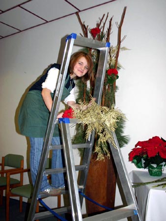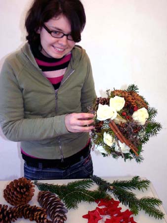 • Kränze herstellen: Tannenzweige, Laubwerk, Zapfen, Schnittblumen, Schleifen u. a. an einer Kranzunterlage aus Draht, Stroh oder Styropor anbringen