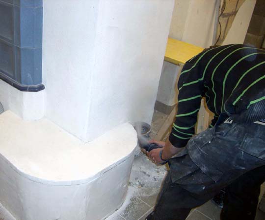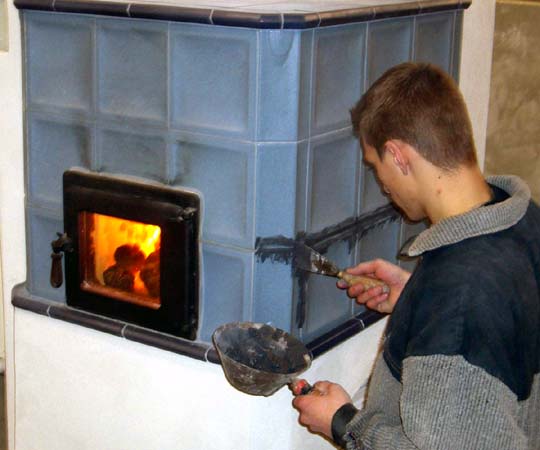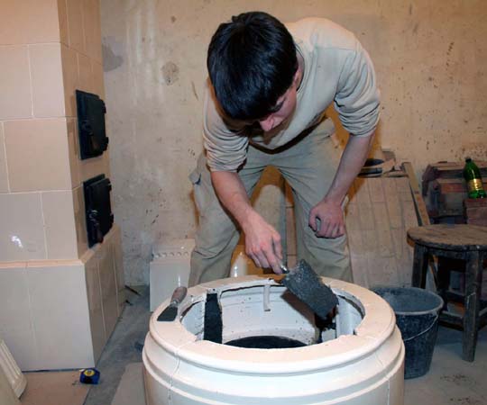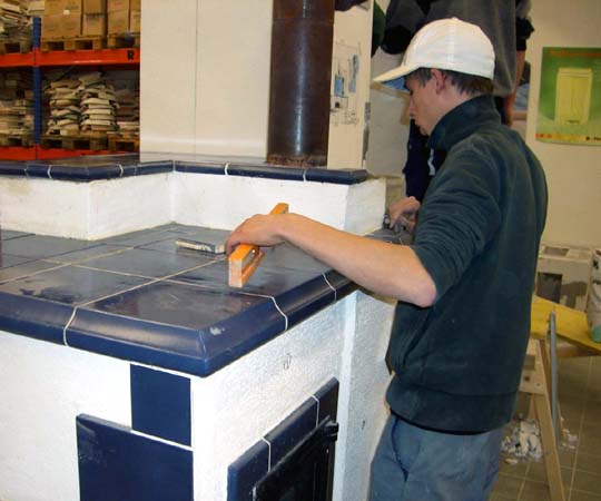 Nachdem sie eine Konstruktionszeichnung unter Berücksichtigung der heiztechnischen Raumgegebenheiten angefertigt haben, berechnen sie den Materialbedarf. Je nach Aufstellungsort tragen sie eine Schicht aus Zementmörtel ("Estrich") auf, auf den wiederum ein Sockel ("Gesims") aufgemauert wird. Das Gesims dient als Basis für den Ofen. Darauf setzen sie dann die einzelnen Kachelreihen sowie die Ofentür. Die Kacheln schneiden sie zuvor mit einer elektrischen Handschneidemaschine zurecht und bringen auf der Innenseite der Kacheln hitzebeständige Schamotteplatten an. Mit Drahtklammern werden die Teile verbunden. Diesen Vorgang setzen sie solange fort, bis die gewünschte Höhe des Ofens erreicht ist. Zuletzt bringen sie eine Endabdeckung an und verbinden den Ofen durch ein Abzugsrohr mit dem Kamin.