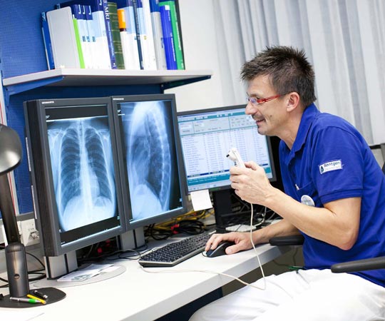 Der Fachbereich Radiologie ist eine Spezialisierung innerhalb der Medizin. Das Sonderfach Radiologie umfasst die Erkennung von Erkrankungen mit Hilfe von Röntgenstrahlen, Ultraschallwellen und Magnetresonanz. Die Fachärzt*innen für Radiologie führen mit Hilfe der entsprechenden bildgebenden Verfahren diagnostische (erkennende) und therapeutische (heilende) Eingriffe durch. Dabei achten sie auf den erforderlichen Strahlenschutz der Patient*innen.